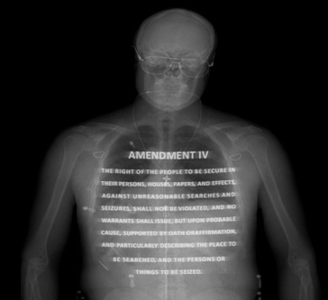 An enterprising company has some up with T-shirts and underwear printed with metallic inks, so that airport screeners will get a chance to read the 4th Amendment (against unreasonable searches) when the wearer goes through a body scanner (see right). The hot items are already sold out, but orders are being taken here.